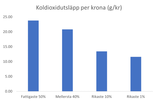 Att rika släpper ut mer koldioxid är knappast förvånande. Det följer dock inte av detta att minskad ojämlikhet skulle minska utsläppen. En figur som inte visas, men som är enkel att ta fram utifrån data i rapporten, är att i stället redovisa utsläpp per krona för olika inkomstgrupper. Figuren nedan visar att utsläpp per krona sjunker med inkomsten. Detta är i sig inget förvånande. Det finns en övre gräns för hur mycket flygresor och annan utsläppsintensiv konsumtion man kan hinna med på ett år. Jag skulle inte bli förvånad om till och med det skamligaste av allt i klimatsammanhang, att flyga privatjet, generar lägre utsläpp per krona än lågprisflyg (det borde definitivt gälla om man flyger i eget plan då planet förmodligen kommer stå på marken större delen av tiden).