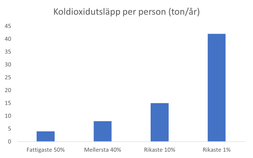 Oxfam har nyligen släppt en rapport som bland annat Dagens Nyheter rapporterat om. I rapporten redovisas koldioxidutsläpp för olika inkomstgrupper i Sverige. Figuren nedan visar utsläppen för olika inkomstgrupper och som synes stiger koldioxidutsläppen per person med inkomsten – de rikaste orsakar betydligt mer utsläpp per person än de fattigaste. I rapporten tas detta samband som intäkt för att ojämlikhet är ett problem för klimatet och att fattigdomsbekämpning, som är Oxfams främsta mål, går hand i hand med att lösa klimatfrågan.