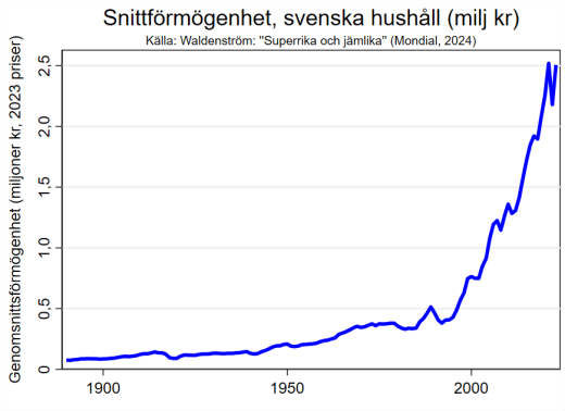 Figuren nedan visar hur svenskarnas genomsnittsförmögenhet har ökat under de senaste 130 åren. Sedan 1890 har den ökat 30 gånger i reala termer, och sedan andra världskriget har den tiodubblats. Varje decennium efter kriget har sett en real ökning av välståndet.