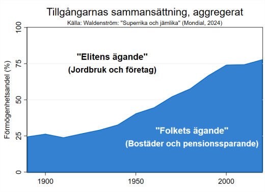 Idag ser ägandet annorlunda ut. Svenskarnas förmögenheter ligger numera till största delen i bostadskapital och fondsparande. Figuren nedan visar att dessa tillgångar numera utgör tre fjärdedelar av all privat förmögenhet i Sverige, alltså även när miljardärernas företagsförmögenheter inkluderas. Denna höga andel är historiskt unik. För hundra år sedan var bostäder och långsiktigt sparande mycket mindre relativt sett, en fjärdedel av alla privata tillgångar.