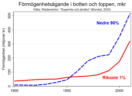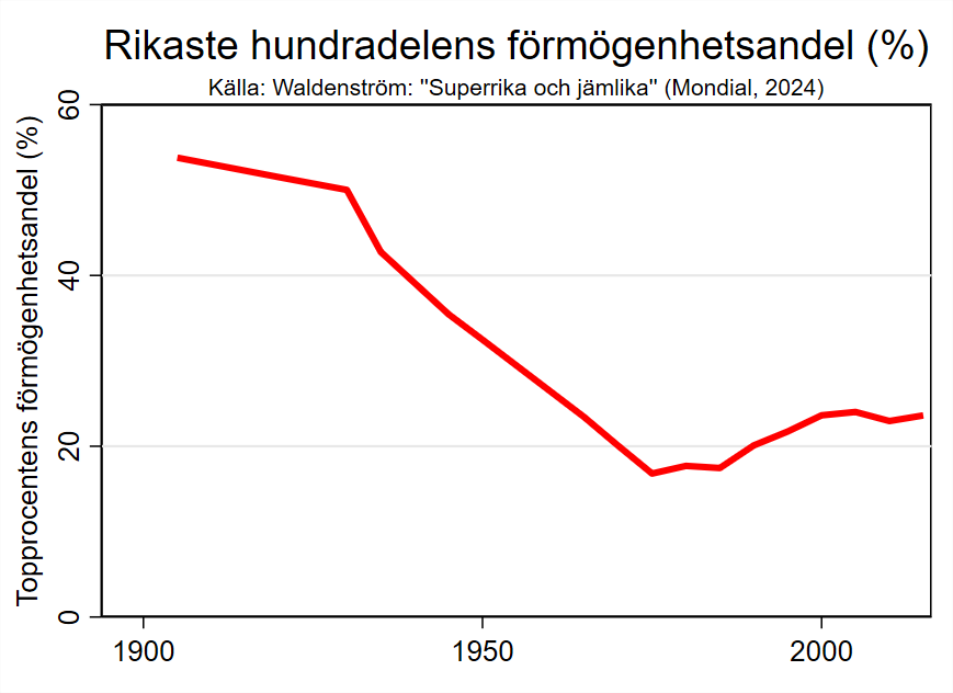 Följande två figurer visar hur förmögenheterna har blivit mer jämlikt fördelade under det senaste århundradet. Den första figuren visar att Sverige för hundra år sedan var ett extremt ojämlikt samhälle i förmögenhetsägande. Den rikaste procenten ägde fyra gånger mer kapital än samtliga personer i befolkningen fattigaste nio tiondelar.