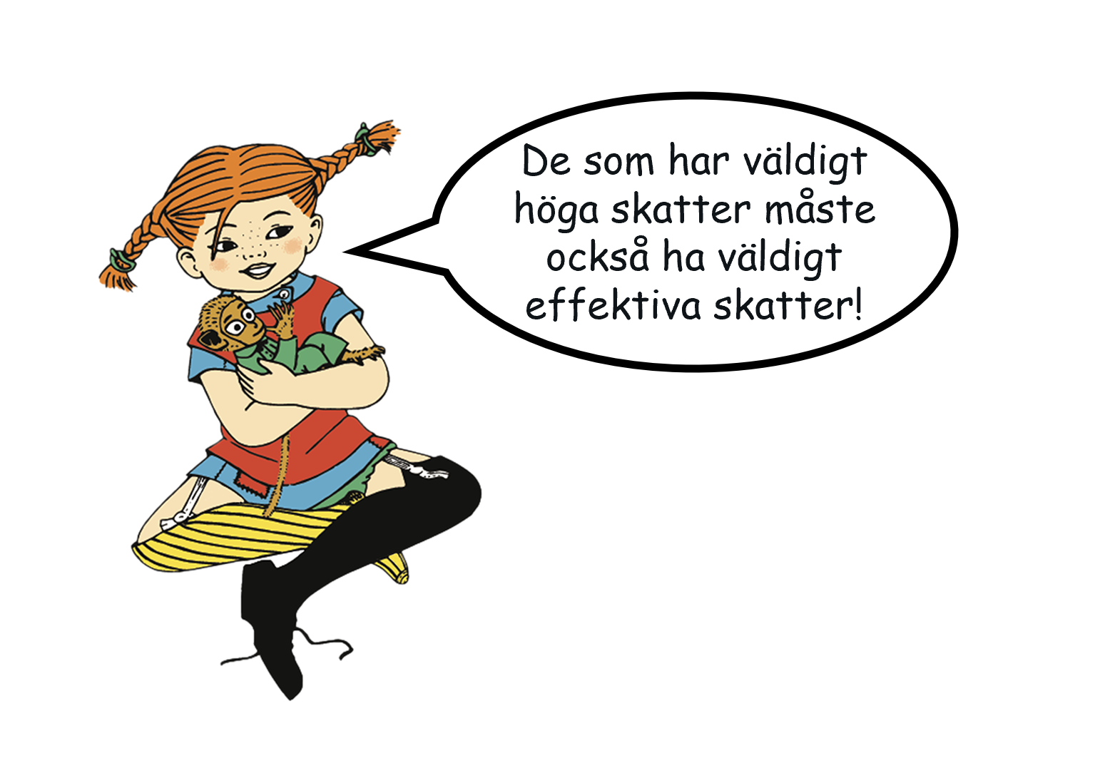 Astrid Lindgren figurerade i svensk skattedebatt på 1970-talet med sin skattekritiska saga om Pomperipossa i Monismanien. Vi hakar på Astrid i DN-artikeln och spekulerar i en annan skattedevis som Pippi Långstrump kunde ha uttryckt som motivering för vår reform: ”Den som har väldigt höga skatter måste också ha väldigt effektiva skatter”.