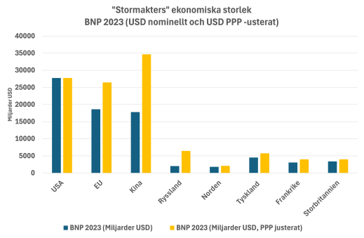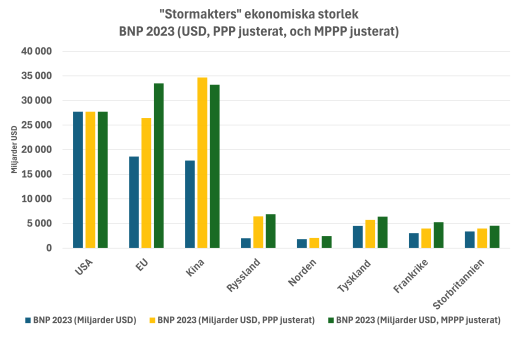 Tar man ett steg tillbaka och ser på dessa jämförelser i ett bredare perspektiv finns också andra slutsatser att dra. USA och Kina är odiskutabelt globala stormakter. Hur styrkeförhållandena mellan dem ser ut beror mycket på hur man justerar ekonomisk och militär kapacitet. Enskilda europeiska länder, även de stora, är i det sammanhanget små var för sig, men tillsammans är EU tydligt den tredje globala stormakten. Att Ryssland räknas dit finns det ingen ekonomisk grund för.