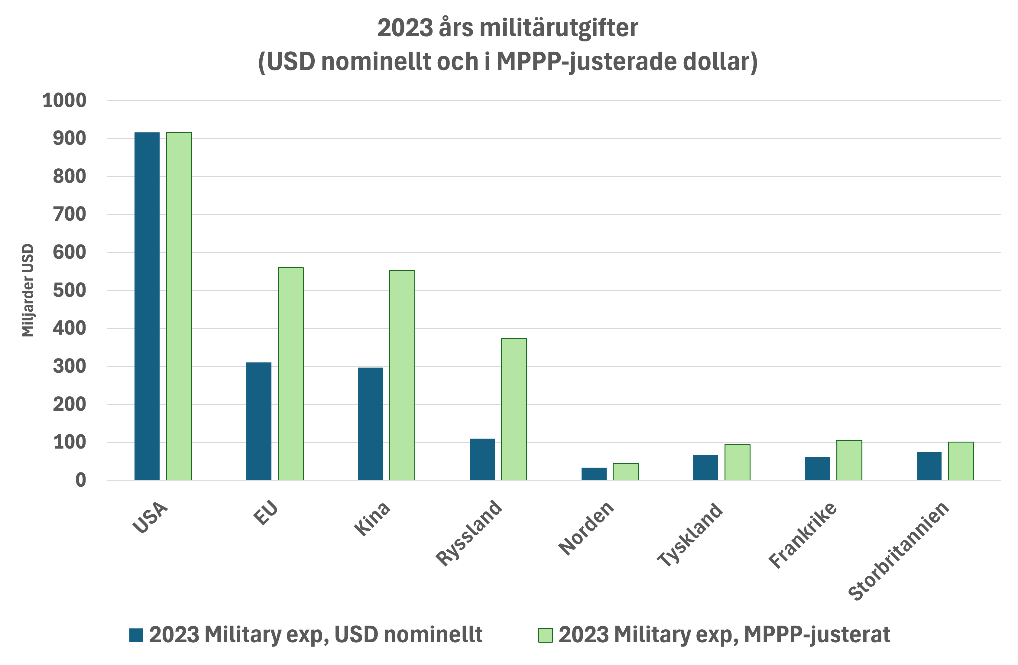 Om man räknar om 2023 års militärutgifter och jämför nominella utlägg i dollar med MPPP-justerade dollar för samma länder som ovan får man följande bild. USA är inte överraskande världens i särklass största militärmakt i termer av hur mycket man årligen lägger på militärutgifter, cirka 910 miljarder. Räknat i nominella dollar är det tre gånger så mycket som Kina och EU spenderar, och nästan nio gånger vad Ryssland lägger. Räknar man om till MPPP-dollar krymper dock avståndet till Kina, men också till EU vars militärkapacitet som kan produceras för 300 miljarder dollar motsvarar ungefär 550 miljarder i MPPP-dollar. Ryssland har en ännu större fördel i militärproduktion så deras utgifter på 110 miljarder motsvarar ungefär 370 miljarder MPPP-dollar.