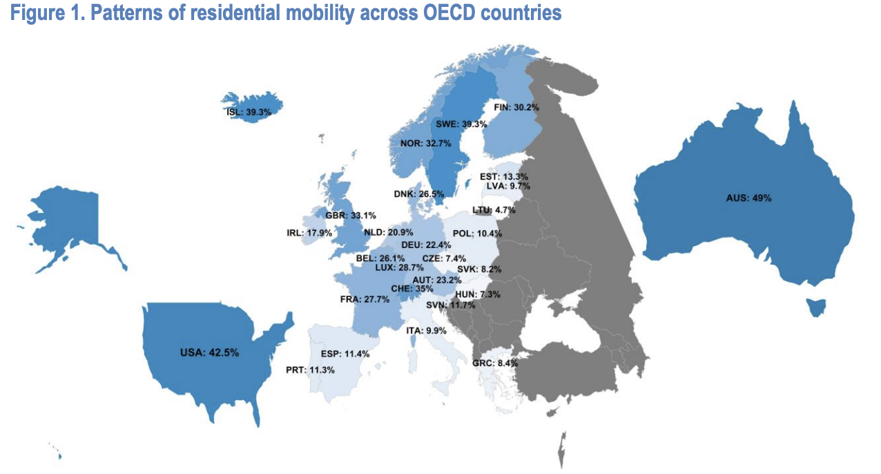 När det gäller rörligheten på bostadsmarknaden så har OECD studerat i olika länder, senaste gången i en rapport från 2020 (för tidigare rapporter, se bl a mitt tidigare inlägg i frågan). Sverige har vid samtliga tillfällen stuckit ut som ett av länderna med allra högst bostadsrörlighet. Vid mätningen 2020 hade 39% av svenskarna bytt boende de senaste fem åren. Detta är faktiskt den högsta nivån i hela EU, att jämföra med exempelvis Finlands 30%, Danmarks 27%, Tysklands 22% eller Italiens 10%.