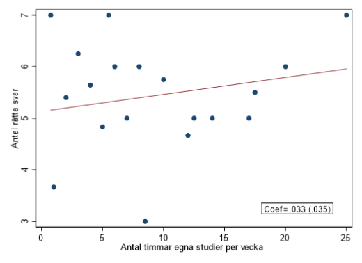Nu tänker dock den vakna läsaren att en alternativ förklaring är att mina föreläsningar är så usla att man inte lär sig något av att gå på dem. Det är en rimlig hypotes som jag inte kan falsifiera med den data jag har. Men däremot kanske vi kan enas om att studera fler timmar inför en dugga borde öka duggaresultatet? Så måste det rimligtvis vara. Figuren nedan visar hur många timmar per vecka som studenterna uppgav att de har pluggat på egen hand veckorna innan duggan. Som synes är korrelationssambandet med duggaresultatet närmast obefintligt även i detta fall (och inte statistiskt signifikant).