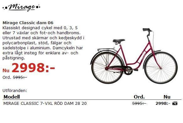 I en del fall får Cykelringens ”realisationer” (detta är inte första gången!) den absurda konsekvensen att en cykel kan bli dyrare när den säljs till halva priset. Bilden till vänster nedan sparades av Google:s sökmotor den 19:e maj 2008. Då kostade cykeln ”Mirage Classic dam 06” 2795 kronor till ordinarie pris. På Cykelringens hemsida idag (2/6) kostade samma cykel 2998 kronor, men då till halva priset! Passa på och köp innan cykeln blir 200 kronor billigare!