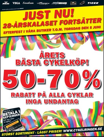 De flesta av oss blir köpglada när det är rea. Cykelringens pågående kampanj lockade både mig och några av Veckorevyns Ebba von Sydow:s läsare. Kampanjen lovar 50 till 70 procents rabatt på alla cyklar i sortimentet. Problemet är bara att kampanjen till största delen är bluff och enligt min ringa kunskap om ämnet dessutom ett flagrant lagbrott. Det Cykelringen ägnar sig åt är att föga diskret höja de ordinarie priserna inför kampanjen — både på Internet och i butikerna.