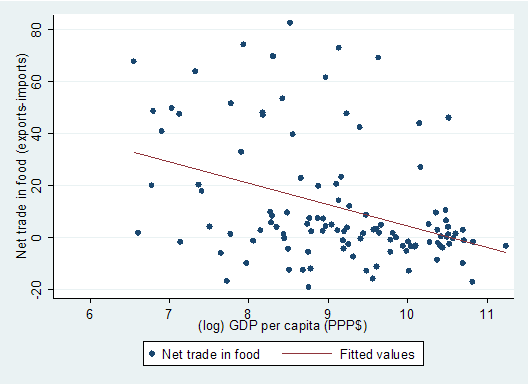 Ett sätt att reda ut vem som är vinnare och förlorare på stigande priser är att undersöka vilka som är nettoexportörer och nettoimportörer av en vara. När priserna stiger gynnas exportören på importörens bekostnad. I nedanstående diagram plottas nettoexporten av livsmedel mot BNP per capita (data från World Development Indicators avser år 2006). Även om spridningen är stor finns ett tydligt samband som visar att fattiga länder tenderar att vara de som tjänar på stigande priser. Samma mönster finns om man bara undersöker länder med inkomster under medianen.