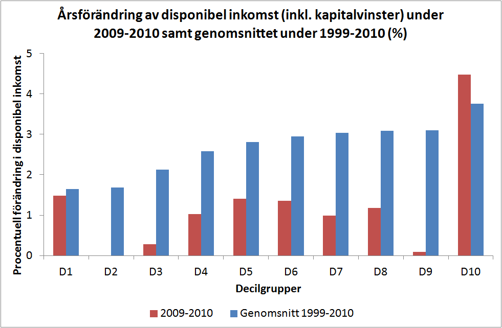 I SCB:s nysläppta statistik redovisas även tabeller över olika decilgruppers genomsnittsinkomster och deras andelar av totalinkomsten. Figuren nedan baseras på dessa data och ger en fingervisning om hur inkomsterna förändrats i olika delar av fördelningen. Den reala medianinkomsten växte med 1,5% mellan 2009 och 2010 och nästan 3% per år mellan 1999 och 2010. Störst i båda fallen har ökningen varit i den översta decilgruppen. Intressant nog har den lägsta decilgruppen haft lägst real inkomsttillväxt sedan 1999, i genomsnitt 1,6%, men näst högst inkomstökning sedan 2009 på 1,5%.