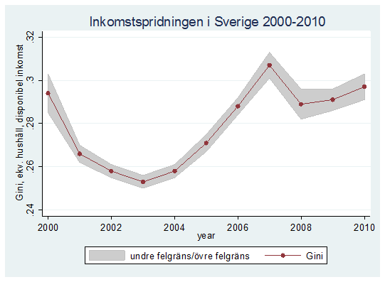 Har då inkomstskillnaderna ökat det senaste året? Bilden nedan ger svaret (källa). Den visar utvecklingen för det vanligaste samlingsmåttet för inkomstspridningen: Ginikoefficienten för hushållens disponibla inkomster. Gini har ökat varje år sedan 2008, men om man tittar på felmarginalerna, som visas av det grå fältet som omger punktskattningarna, framgår att ingen statistiskt säkerställd ökad inkomstspridning har ägt rum. Orsaken till den statistiska osäkerheten är framför allt HEK-urvalets begränsade storlek.