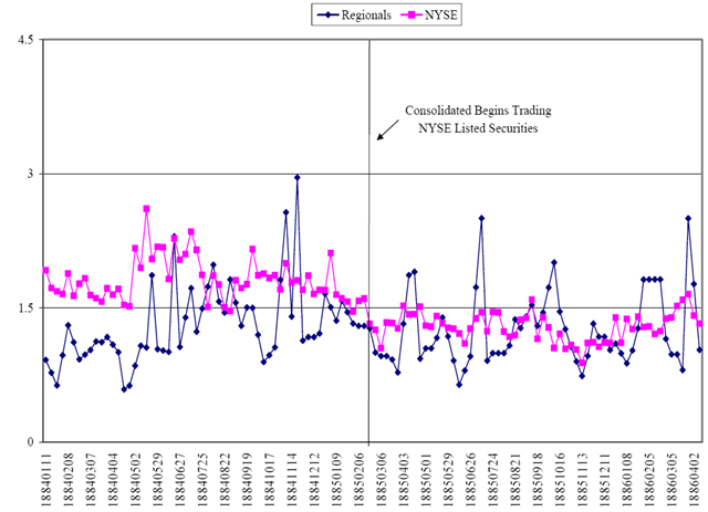 rin, Marc Weidenmier visar t ex hur börsmäklarnas provisioner och transaktionskostnaderna (s k bid-ask spreads) på New York Stock Exchange sjönk markant när börsen utsattes för konkurrens från the Consolidated Stock Exchange of New York på slutet av 1800-talet. När The Consolidated upphörde sin verksamhet 1926 steg provisionerna och spreaden på motsvarande sätt.