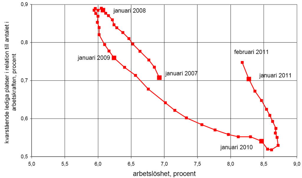 Glädjedödarens uppgift är att föra fram budskapet ingen vill höra. Figuren nedan visar den s k Beveridgekurvan för Sverige, dvs sambandet mellan andelen arbetslösa och antalet kvarstående lediga platser som andel av antalet personer i arbetskraften (data är tolvmånaders glidande medelvärden hämtade från AKU och Arbetsförmedlingen). Krisen under 2009 syns tydligt: Arbetslösheten steg från drygt 6 procent i januari 2009 till 8,5 procent ett år senare. Samtidigt minskade vakanstalet från ca 0,75 till ca 0,55.