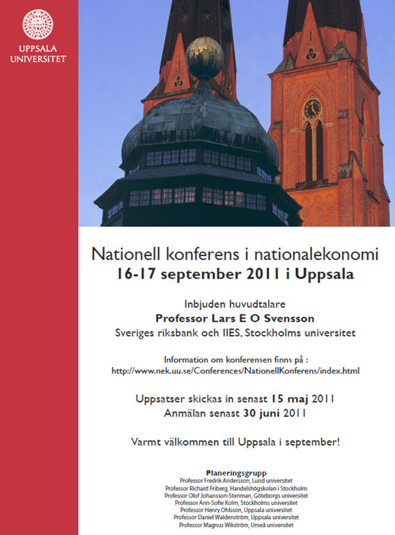Nu är det så dags igen. Den 16-17 september 2011 äger den andra nationella konferensen i nationalekonomi rum, denna gång i Uppsala. Formen är densamma: en och en halv dag, parallella sessioner, plenarföreläsning – denna gång med vice riksbankschef Lars E O Svensson – och en paneldebatt.