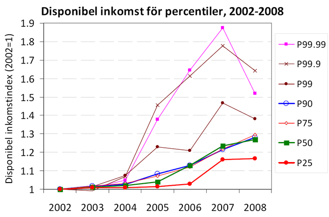 I en artikel i Ekonomisk Debatt 2006 presenterade Jesper Roine och jag tidsserier över de svenska toppinkomsternas andel av totalinkomsten i landet under perioden 1903-2004. Bland våra huvudresultat var att sedan 1980-talets början har toppinkomstandelarna ökat markant och den i särklas största ökningen har ägt rum i den yttersta toppen av fördelningen, i topprocenten (P99-100, dvs de ca 80.000 personerna med allra högst inkomster), medan resten av toppdecilens inkomster (P90-95 resp. P95-99) utvecklats i nivå med övriga befolkningens.