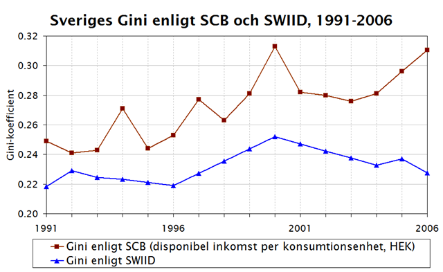 Diagrammet nedan visar Sveriges gini 1991-2006 i SWIID och SCB . Varken trender eller nivåer stämmer överens. SWIID:s serie ligger inte bara betydligt lägre utan faller kraftigt 2001-06 medan den stiger i SCB:s serie. Än värre förefaller SWIID:s serie vara linjärt interpolerad mellan vissa år (se de spikraka strecken mellan 1993, 1996, 2000, 2004).